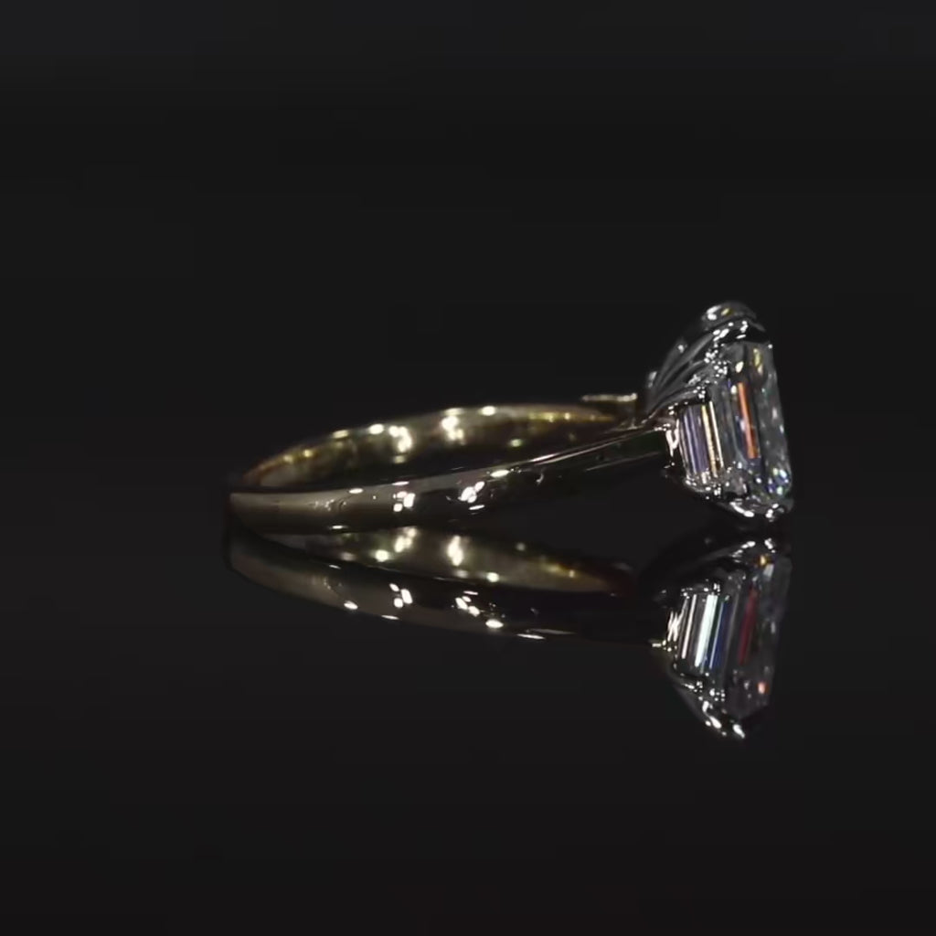 Introducing the Kara Ring—a luxurious three-stone design that combines bold elegance with sophisticated craftsmanship. At the heart of this exquisite piece is a 2.50ct elongated cushion-cut diamond, celebrated for its soft, rounded edges and exceptional brilliance.