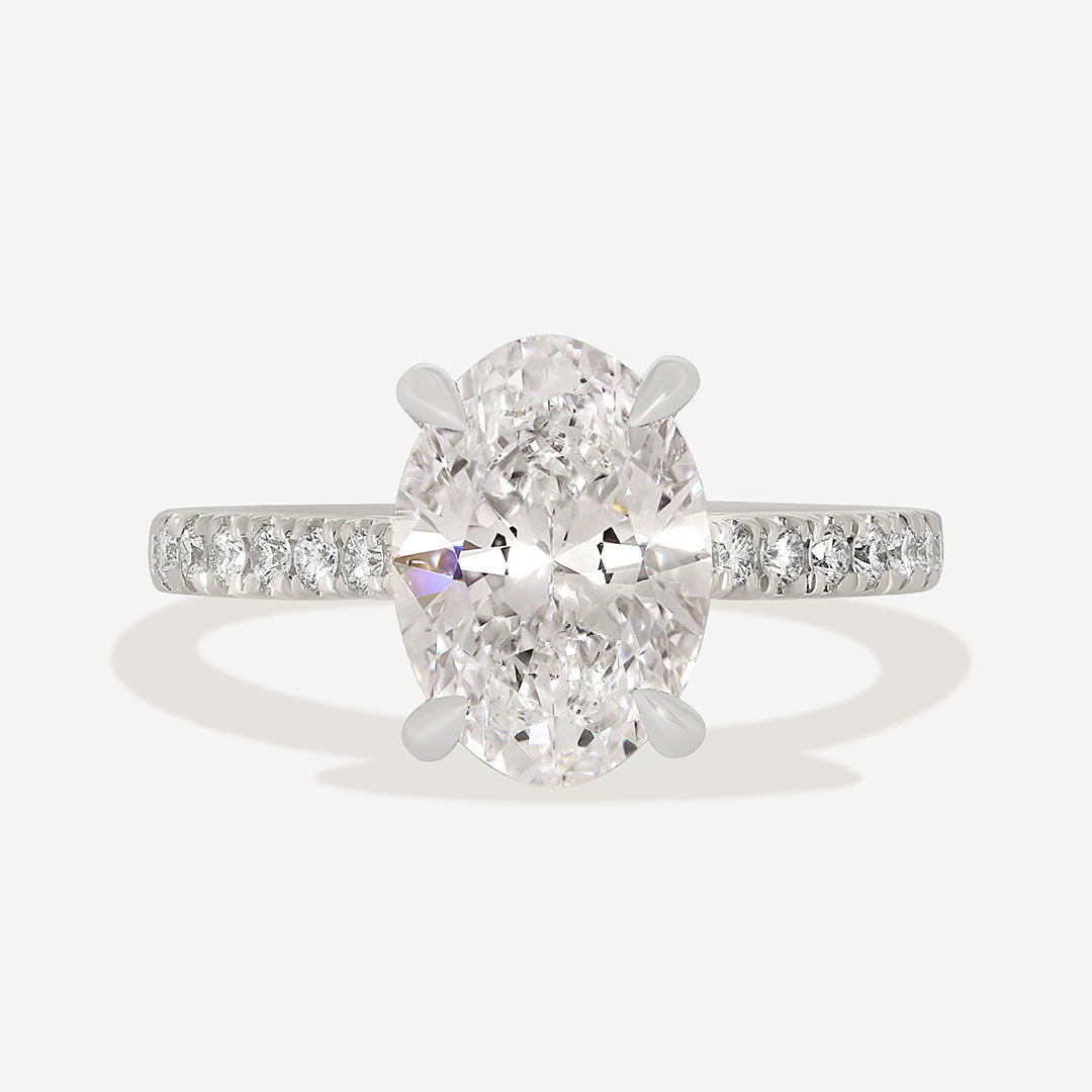 This 2.50ct centre oval-cut lab-diamond offers a softly elongated silhouette and a flowing sparkle that flatters the hand with ease. Its brilliant facet arrangement creates a refined glow that feels light yet purposeful.