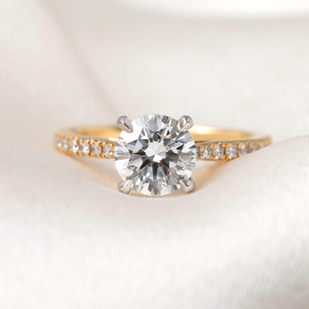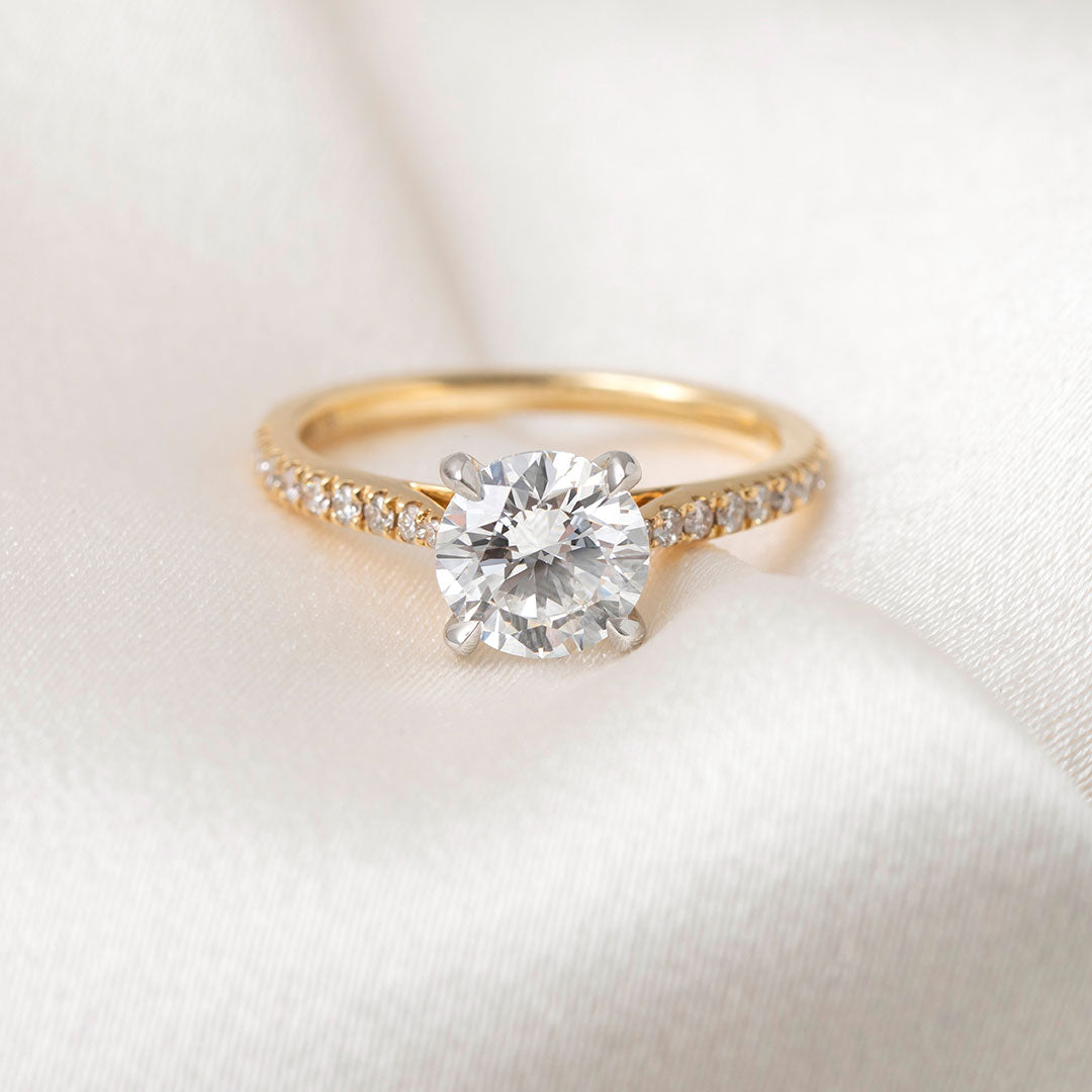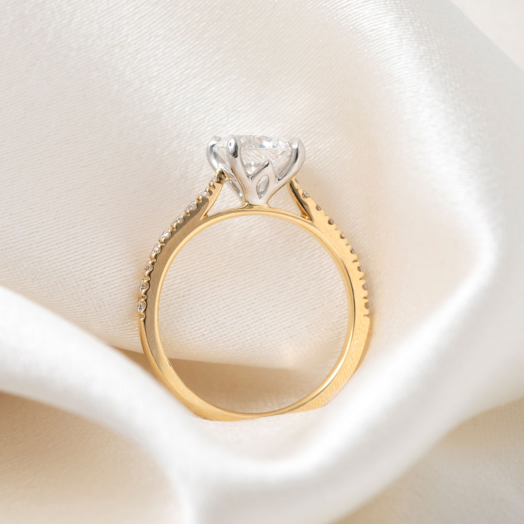 Crafted in 18ct gold, this ring features a hand-set four-claw platinum setting that securely holds the centre diamond. The shoulders are lined with pavé-set lab-diamonds, adding a touch of radiance that extends along the finger.