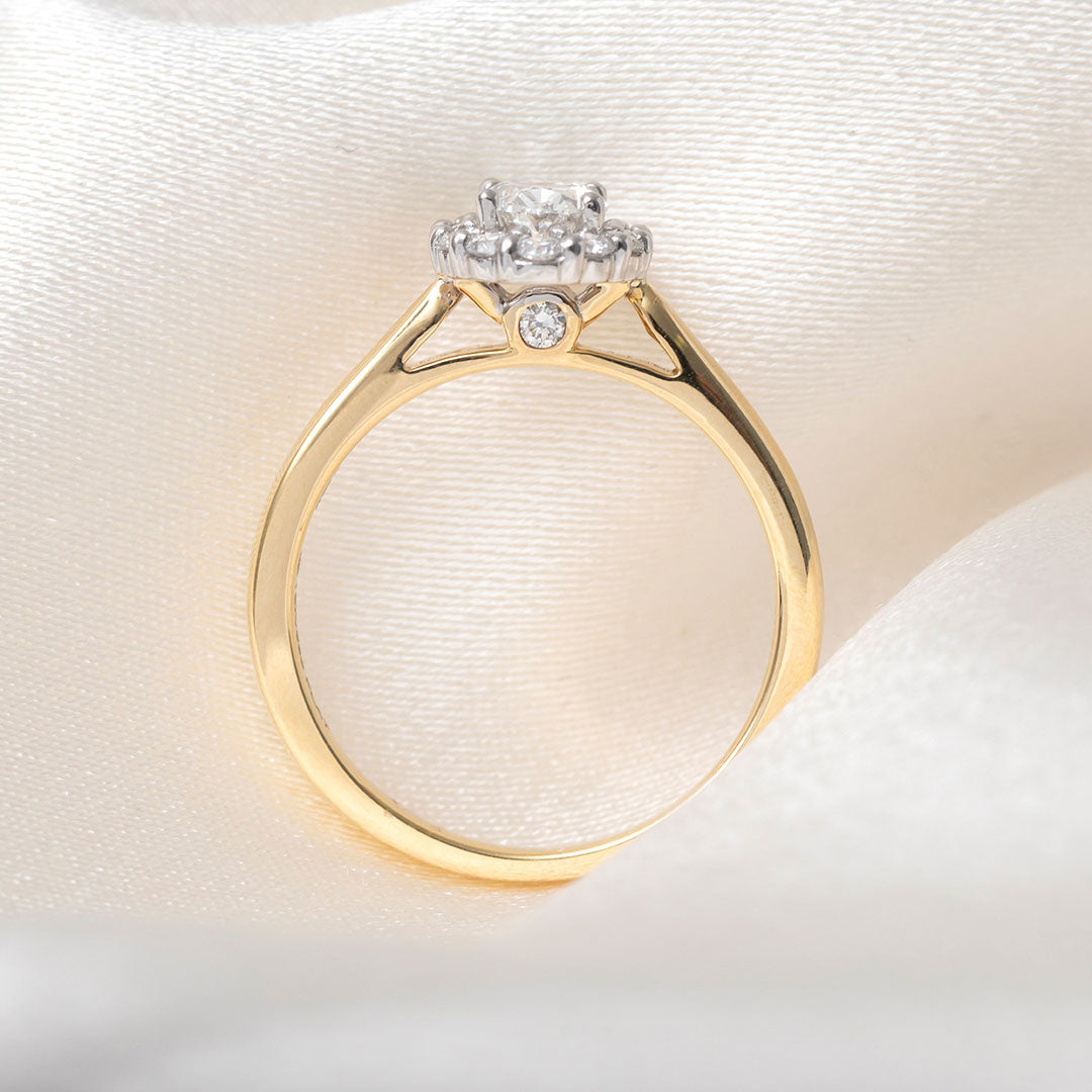 Get ready to dazzle with the Gear Jewellers Khan engagement ring! This 18ct gold and platinum diamond beauty features an oval diamond surrounded by a round brilliant cut halo and a unique diamond gallery below the head. Talk about a show-stopper!