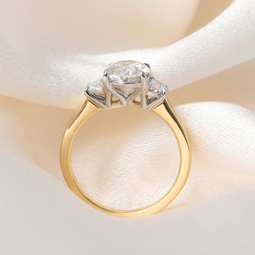 Set in 18ct gold with platinum claws, the design pairs structural security with visual contrast. The side diamonds are set to gently frame the centre, creating a seamless transition across the ring while the polished gold band adds warmth and refinement.