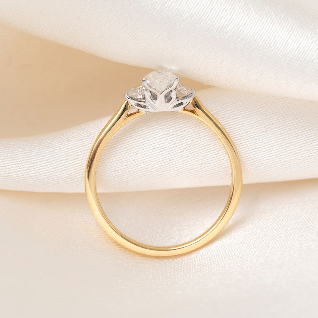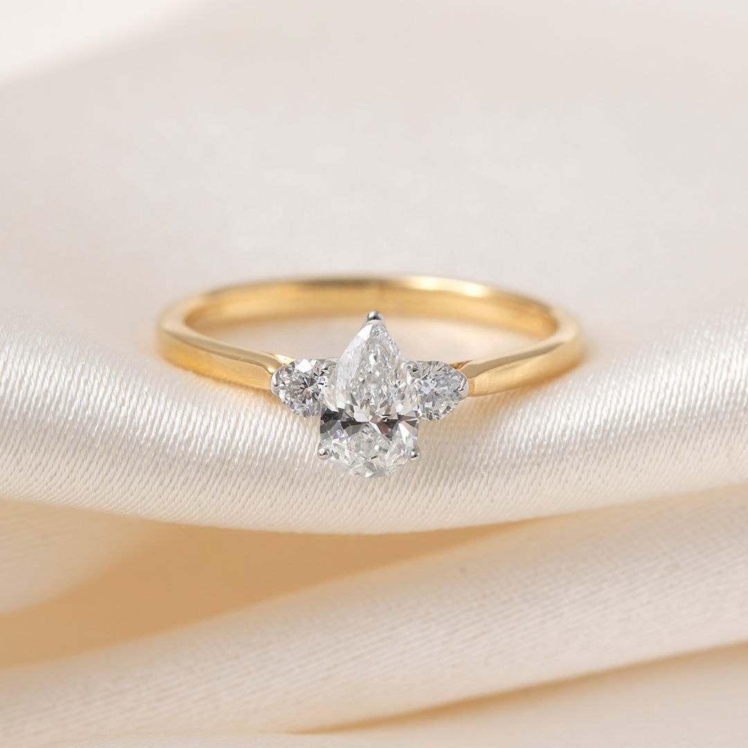 The Gear Jewellers Trei ring is a beautiful pear and round diamond cut three stone engagement ring with a total diamond weight of 0.66ct.