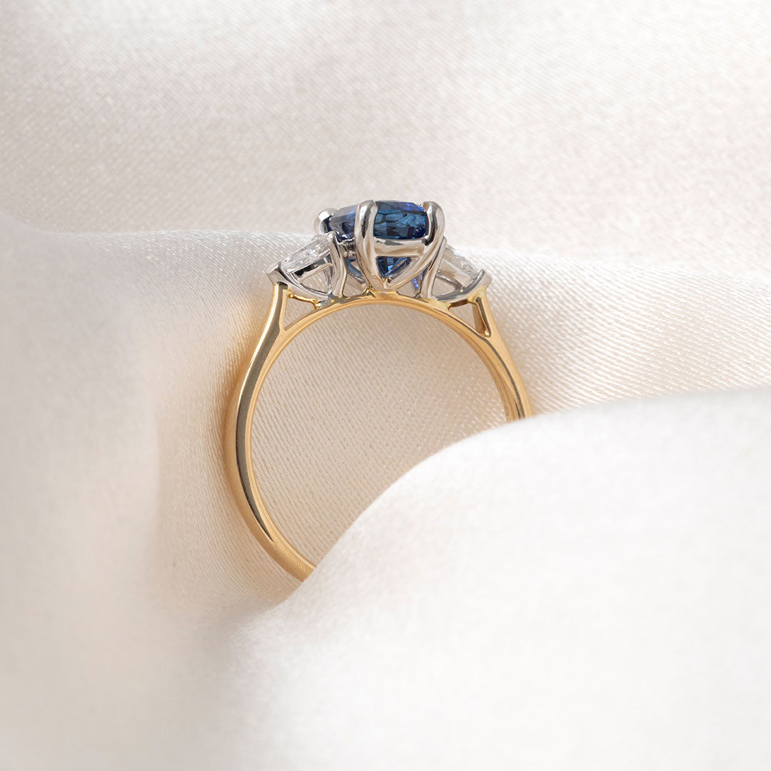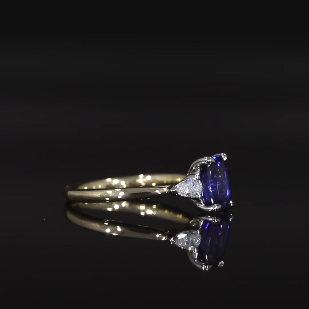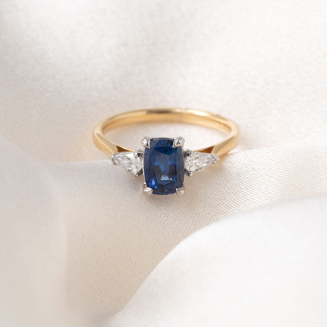 Our beautiful Gwen ring features a beautifully rich elongated cushion Sapphire center with two pear shaped diamonds on either side of the sapphire for a gorgeous sparkle and unique design. Each diamond and the sapphire center are secured with a platinum setting for extra security.