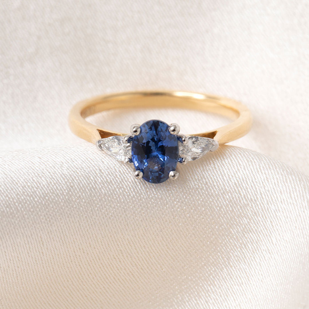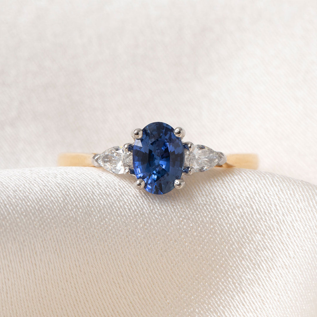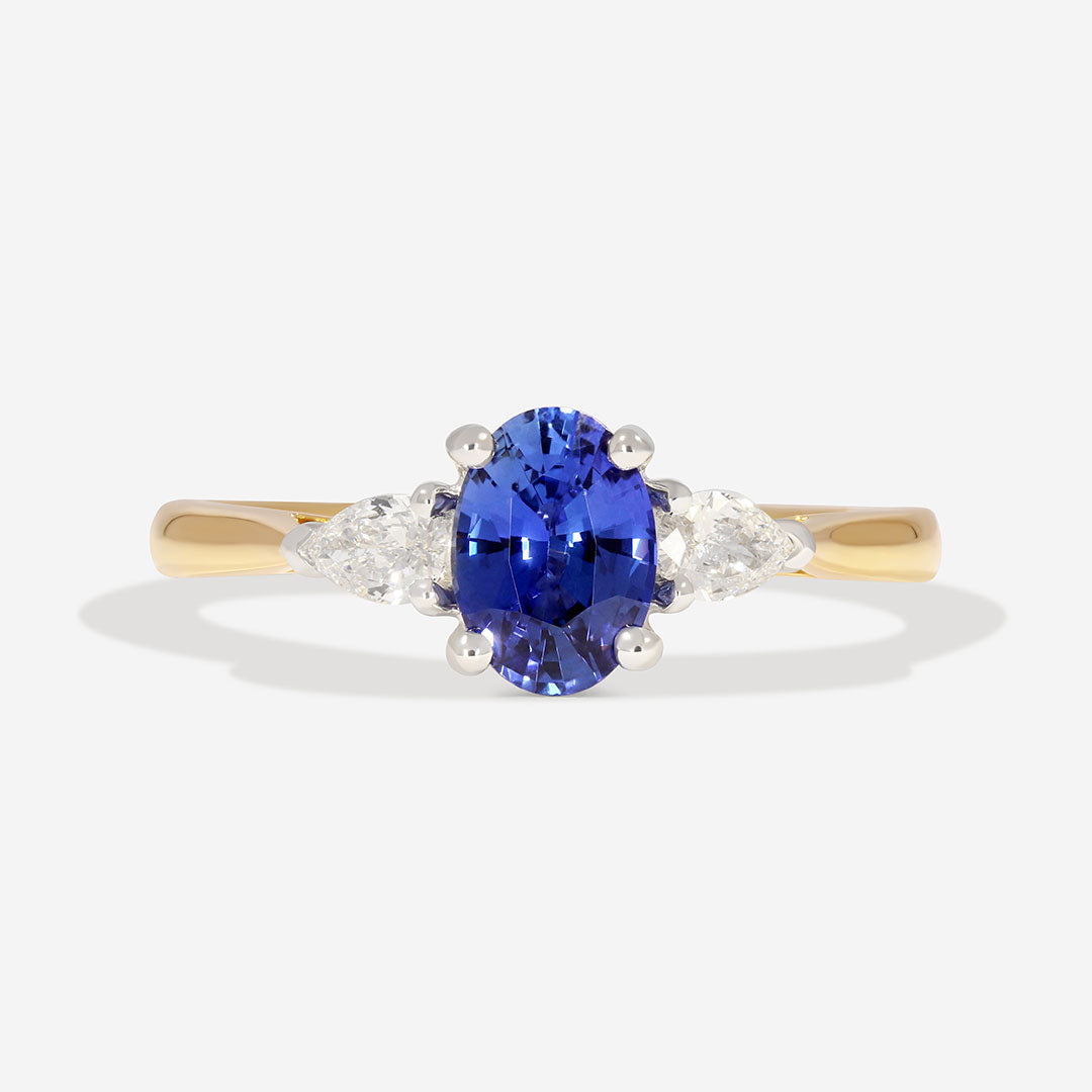 Our classic Howth ring features a beautifully deep blue oval Sapphire center with two pear shaped diamonds on either side of the sapphire for a gorgeous sparkle and classic design. Each diamond and the sapphire center are secured with a platinum setting for extra security.