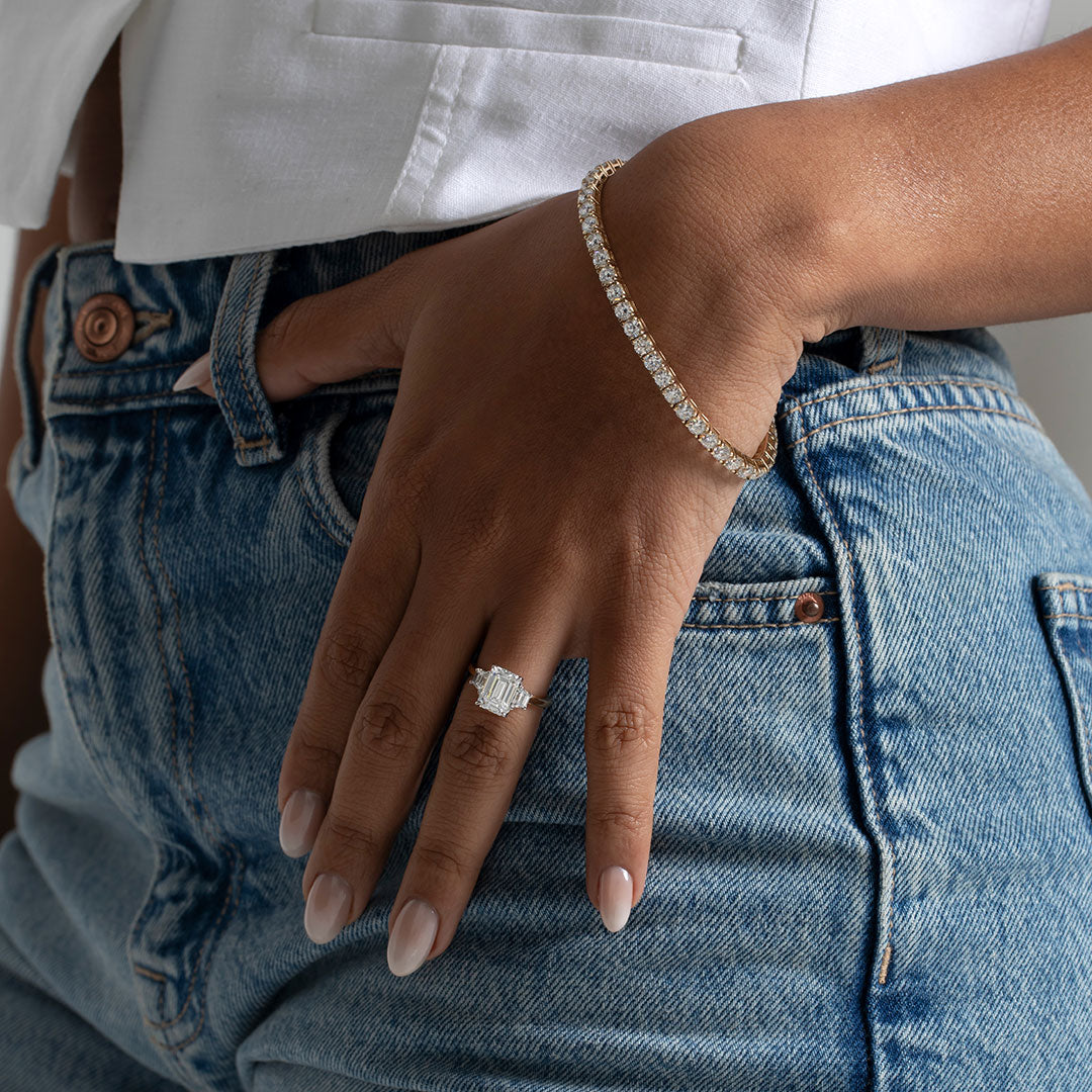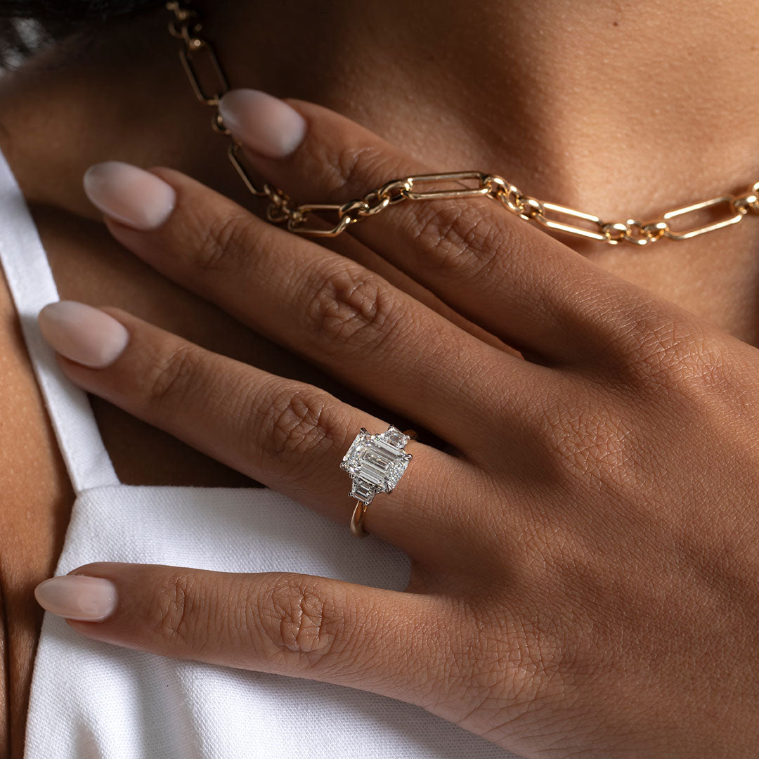 An emerald-cut lab-diamond sits at the centre of this structured three-diamond composition, its step-cut facets reflecting light with precision and clarity. At 3.00ct, the rectangular centre is balanced by tapered trapezoid side lab-diamonds that echo its geometry and elongate the overall design.
