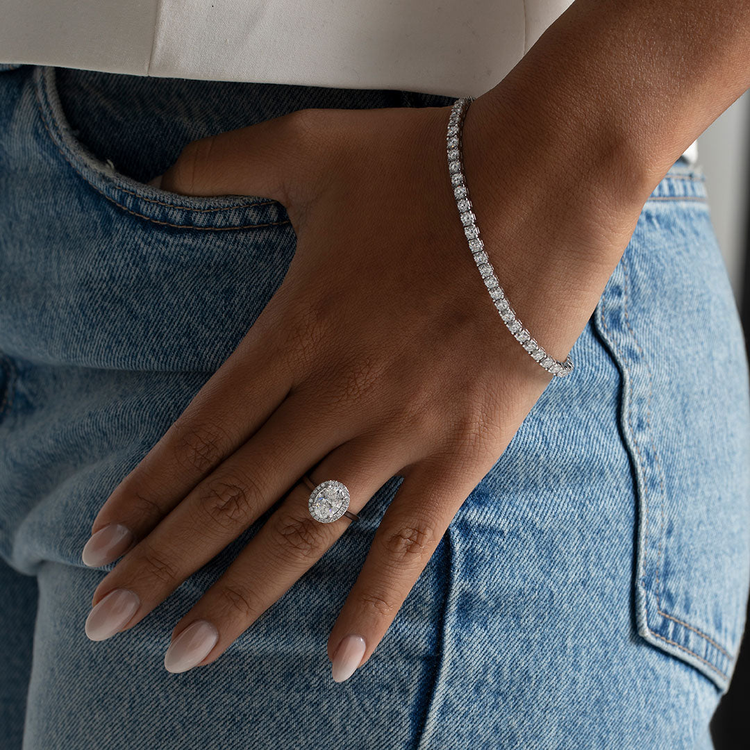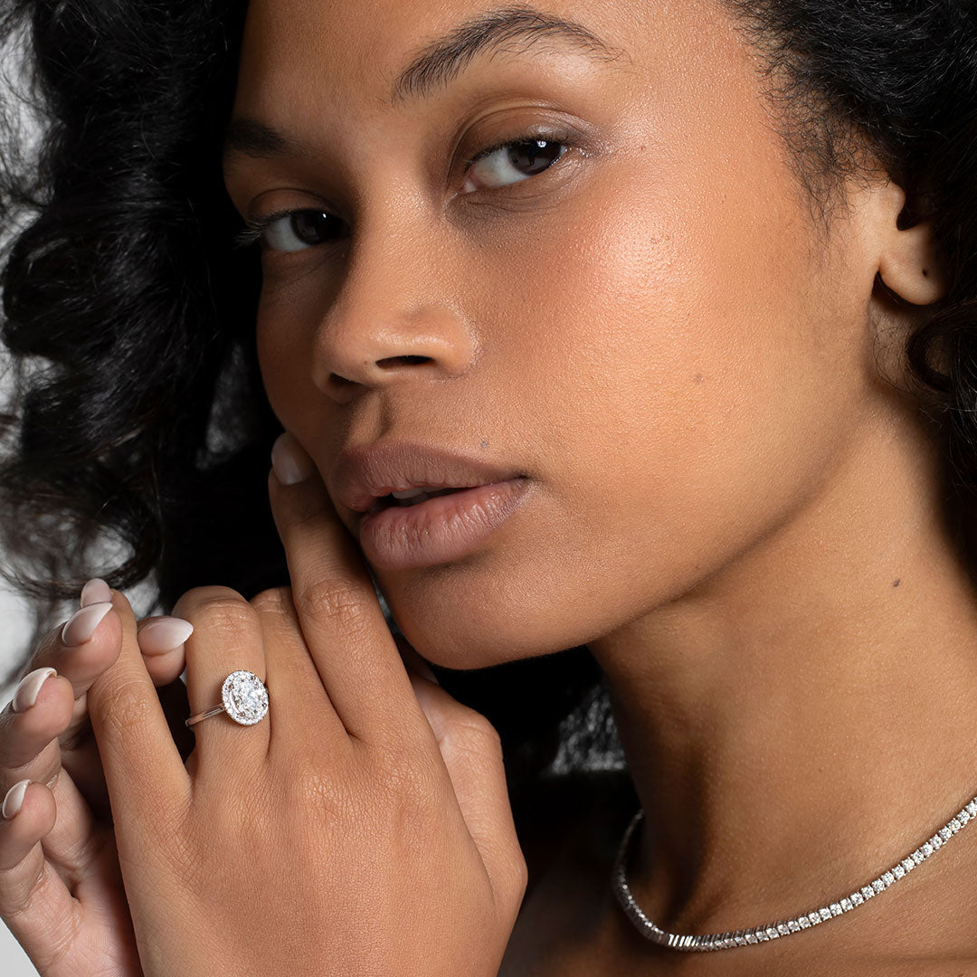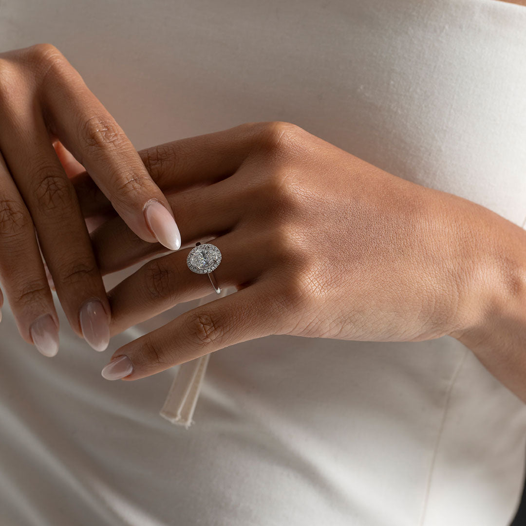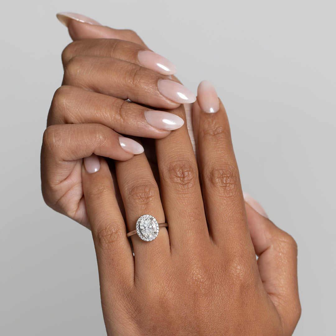 An oval-cut lab-grown diamond known for its flattering shape and consistent brilliance defines this detailed halo design. 2ct total diamond weight. The centre diamond exhibits a balanced silhouette with brilliant-cut facets that enhance finger coverage without overpowering.