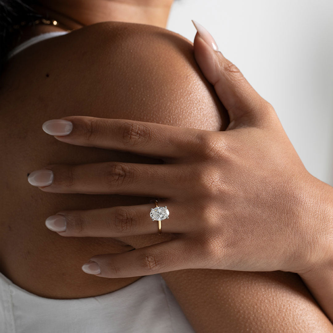 Introducing our new Zariyah Diamond Engagement Ring. The epitomy of refined elegance. This oval Lab-Grown diamond is a timeless shape and radiates sparkle. Our Zariyah ring has a dropped hidden halo, delicately set in beautiful platinum beneath the sparkling elongated oval diamond and finished with a sleek, tapered gold band.